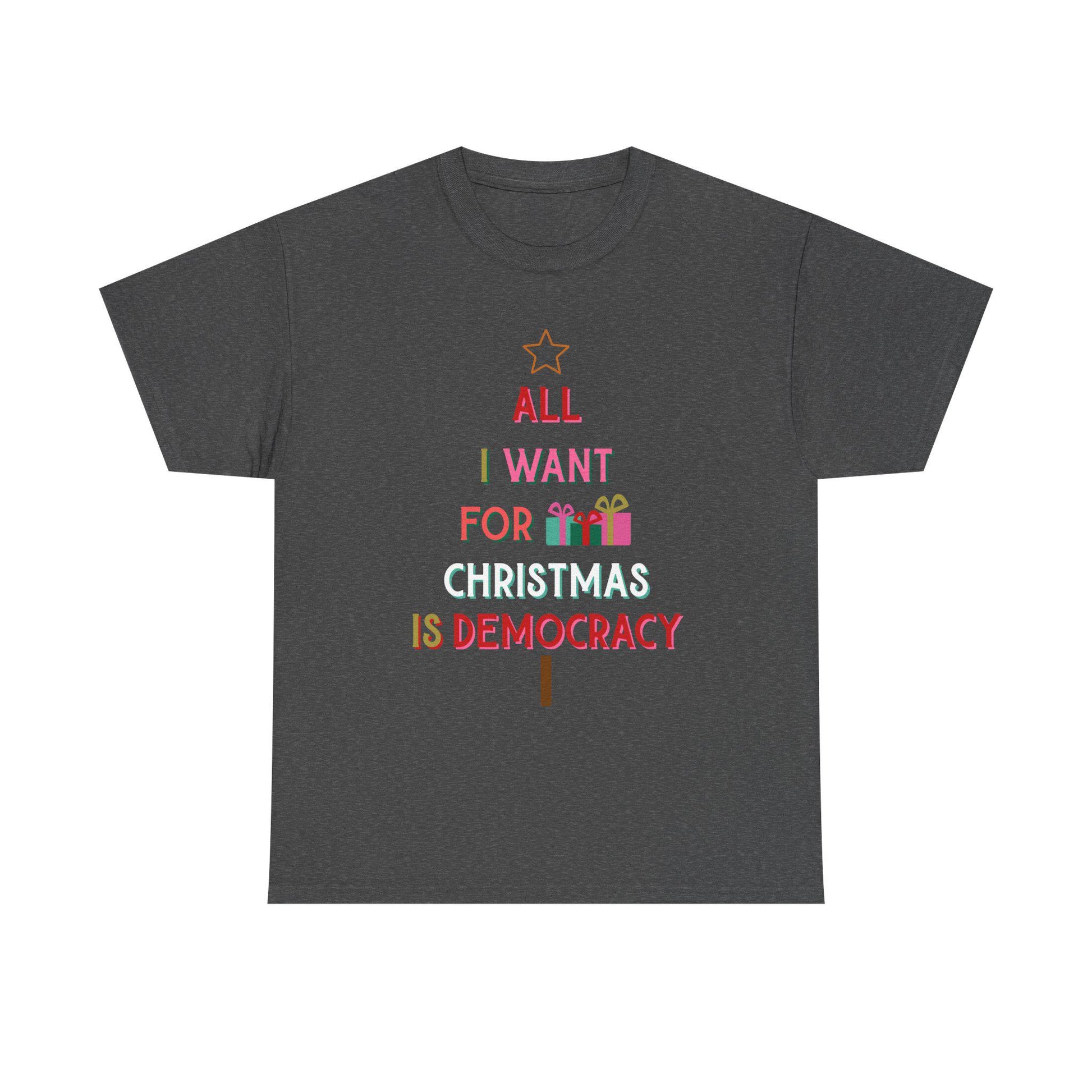 Light, casual, and quietly bold - this tee turns a holiday message into a small act of civic-minded style. The soft white cotton shows a playful, colorful typography layout that reads like a hand-lettered card: star at the top, a tiny gift illustration, and the cheeky line that reworks a festive wish into a call for democracy. It sits close to the body with a classic crew neck and relaxed fit so it layers easily under jackets or wears solo with jeans. Wear it to seasonal meetups, local town-hall events, or neighborhood carol nights when you want your values to be part of the conversation without shouting. The fabric has a smooth, strong surface that keeps the print crisp wash after wash, while the tear-away label and ribbed collar keep it comfortable through long evenings and endless cups of hot cocoa.