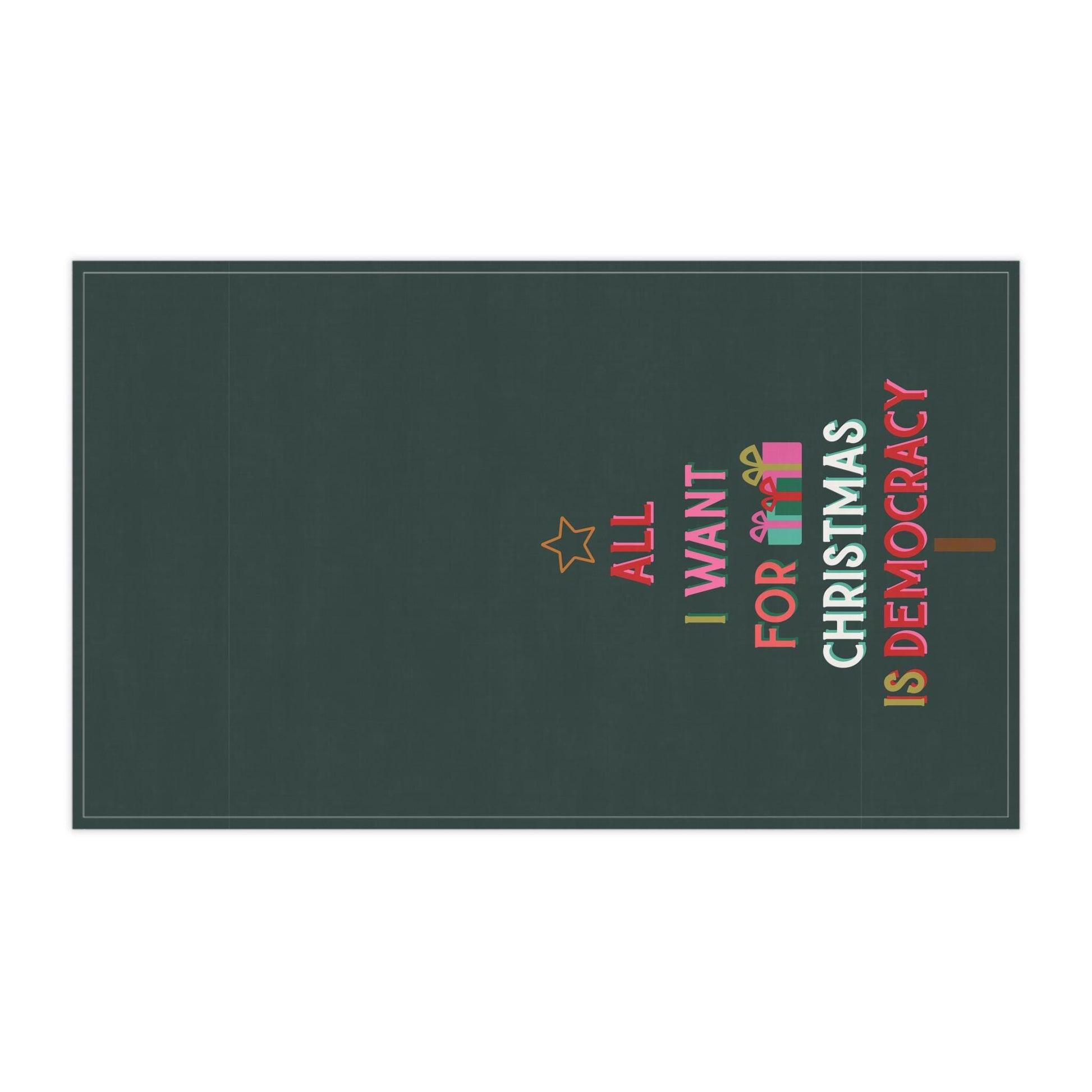 Turn everyday kitchen moments into a small act of joy and protest with this playful holiday tea towel. A deep evergreen background frames a festive typographic tree that reads "All I want for Christmas is democracy," rendered in bright, candy-like colors and tiny gift icons. It hangs easily on a handle or hook, catching spills and eye-rolls during cookie baking, post-parade cleanups, or spirited dinner conversations. Lightweight and hemmed for durability, it blends function with personality - the kind of piece that starts conversations while doing the chores you already have to do.