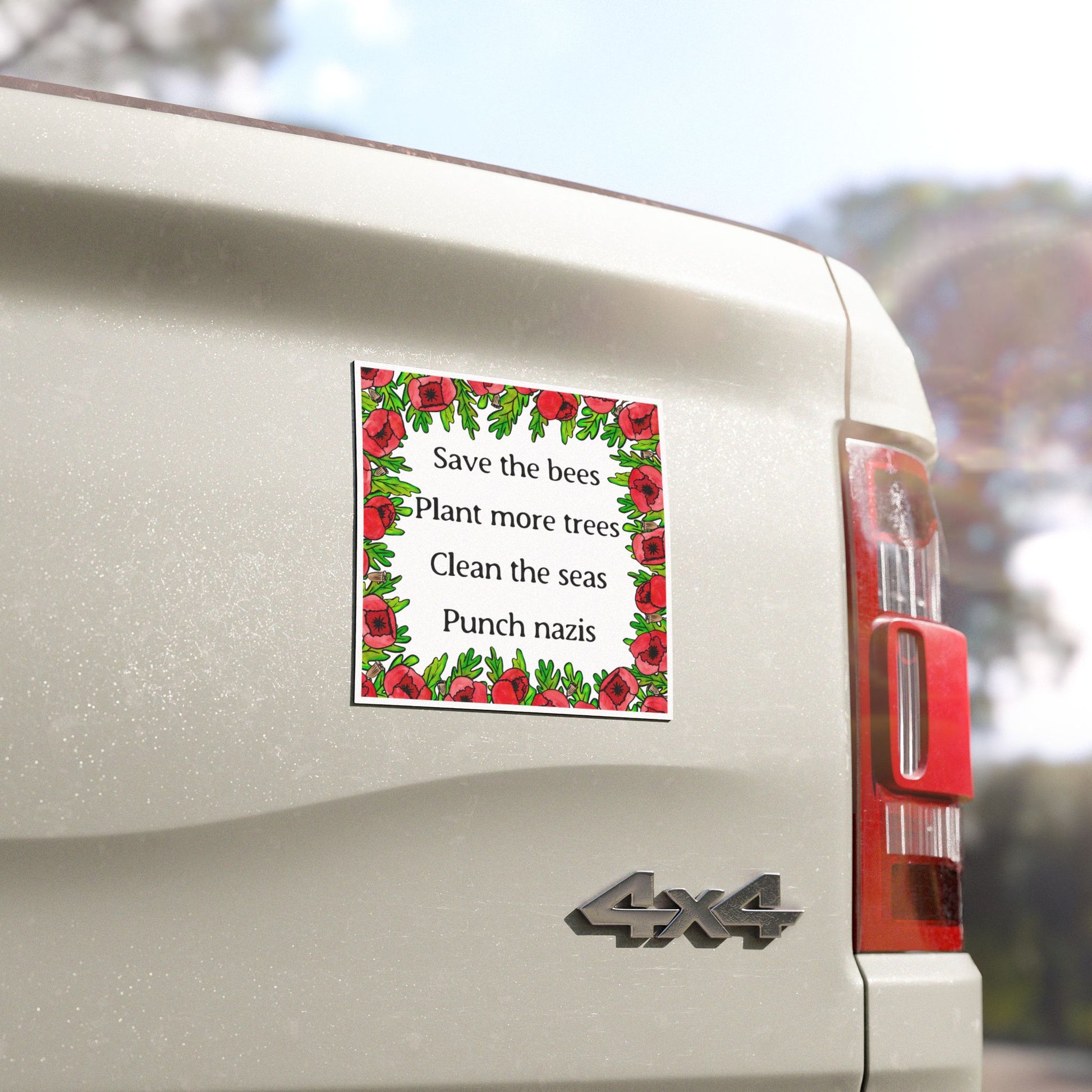 We can all agree that the environment is good and nazis are bad - this 5" x 5" Vinyl Car Magnet is perfect for leftists, activists, and everyday organizers who want to stand up and speak out — even on the road. Whether you’re calling for climate justice, labor rights, healthcare for all, or simply rejecting the status quo, this weatherproof magnet helps carry your values everywhere you go.