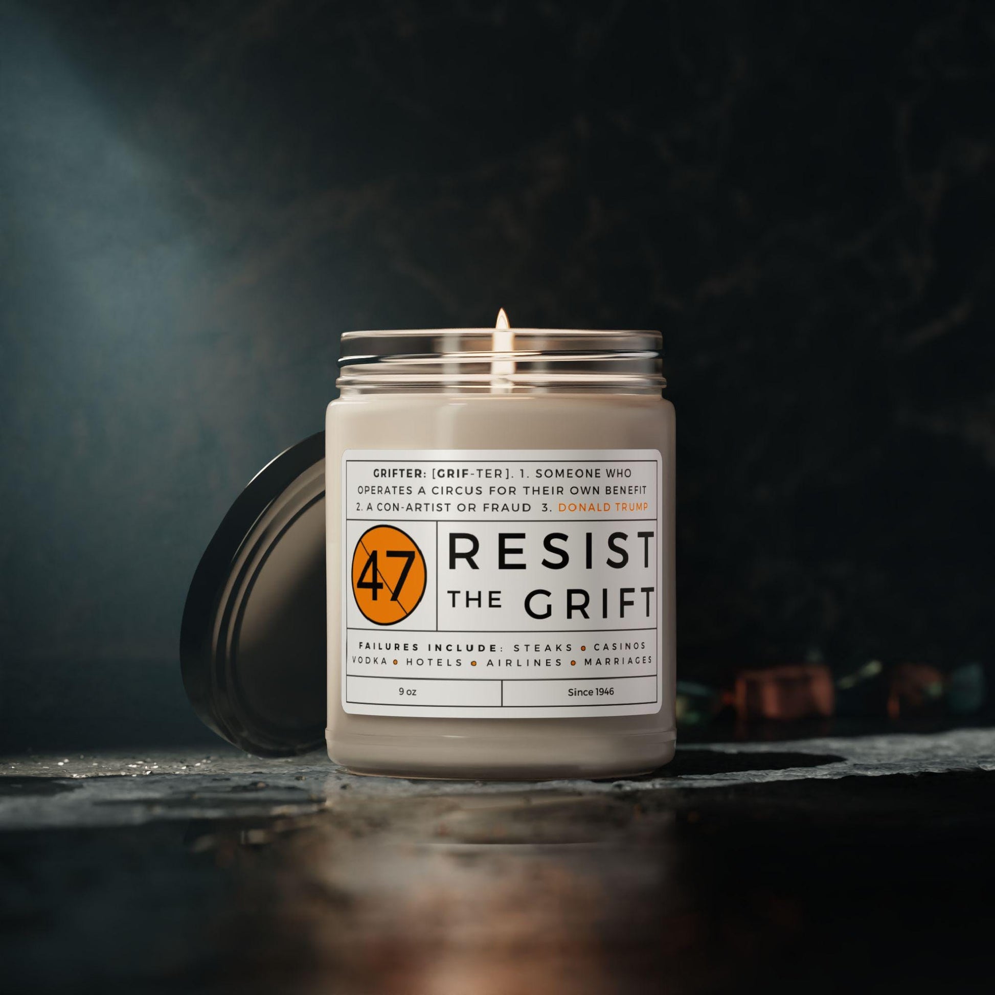 Protest Trump in style with this clean, minimalist candle that lets you defend democracy in a subtle yet stylish way. Show your opposition to fascism with whit and a hint of sarcasm. Resist the Grift candles are a fun way to remind all of us that our president is a conman. Perfect for family, friends, Christmas and birthday presents, white elephants and more!