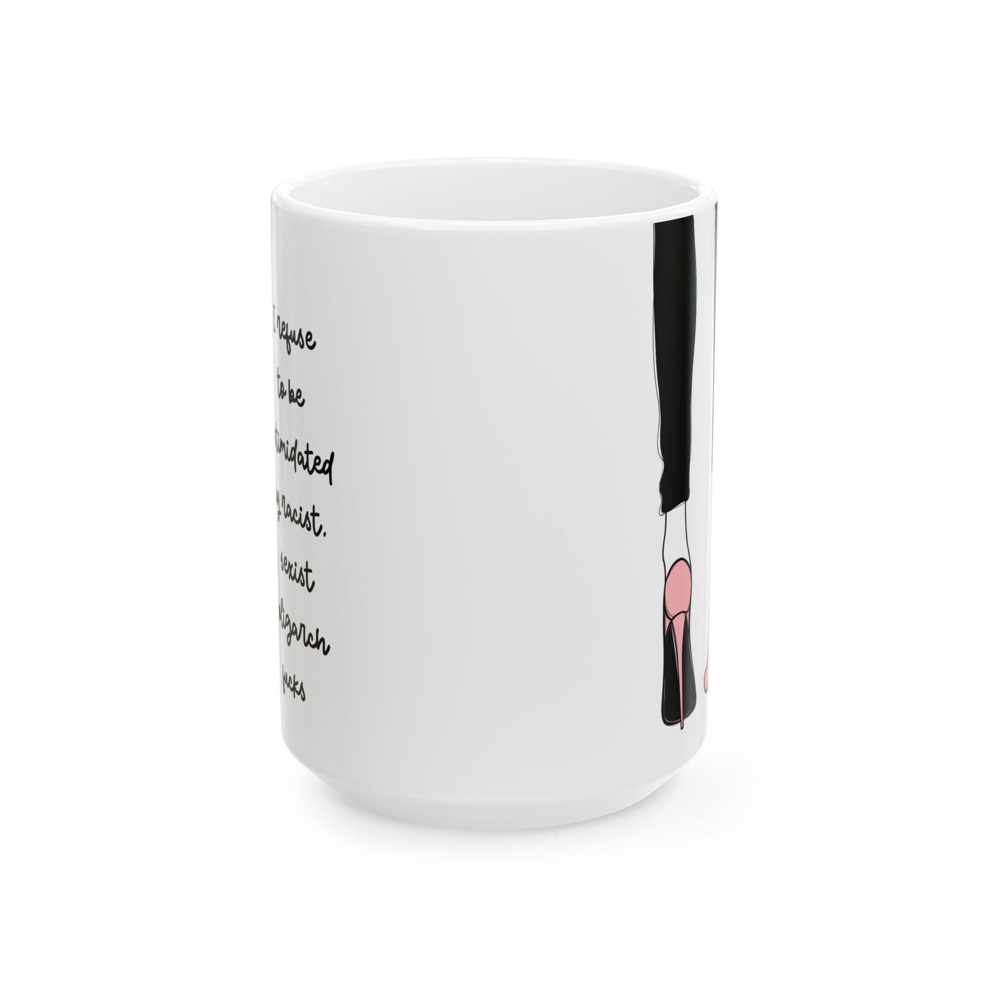 Give Trump and his fascist oligarchy the middle finger with this "I refuse to be intimidated by racist, sexist oligarch fucks" ceramic mug. Available in two convenient sizes – 11 oz and 15 oz – this high-quality ceramic mug is perfect for enjoying your morning coffee, tea, or any hot beverage. Whether you're sipping at home, at work, or gifting to a loved one, this mug combines practicality and durability with a touch of personal flair.