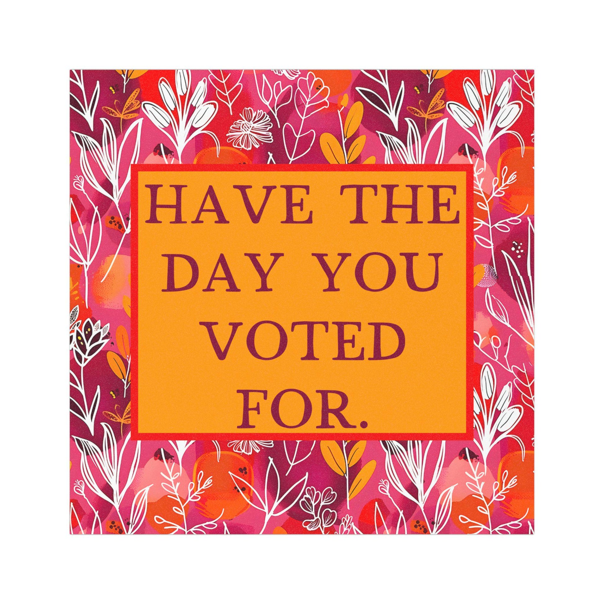 Enhance your vehicle with this subtle anti-Trump "Have the Day You Voted For" car magnet. This subtle fuck trump bumper sticker is perfect for expressing your values or making a statement, and these magnets are the perfect pro democrat, feminist, anti-fascist protest statement piece. Ideal for activists, creative personalities, or anyone who loves to personalize their ride. They're not just for daily commutes; they're great for road trips, parades, and celebrations that call for a little extra fun! These magnets fit beautifully into life during holidays like Earth Day, Pride Month, or any occasion where you wish to stand out and make an impact.