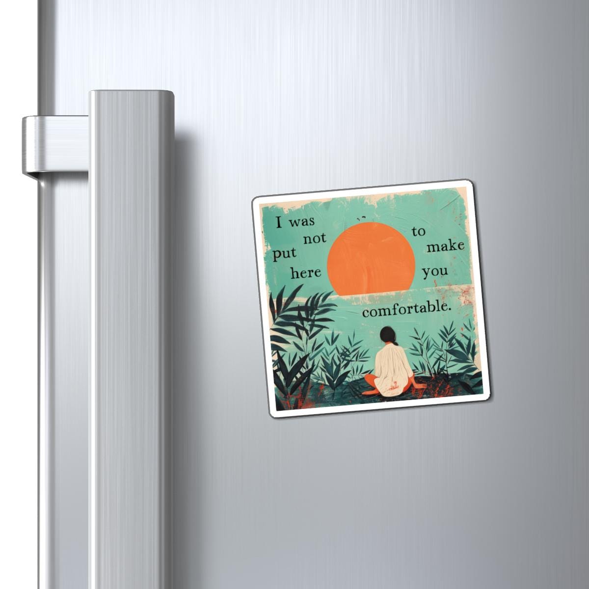 Let people know where you stand with the patriarchy and its expectations of women with this "I was not put here to make you comfortable" magnet! Minimalist yet direct, this is the perfect addition to your refrigerator, filing cabinet or any other magnetic surface.