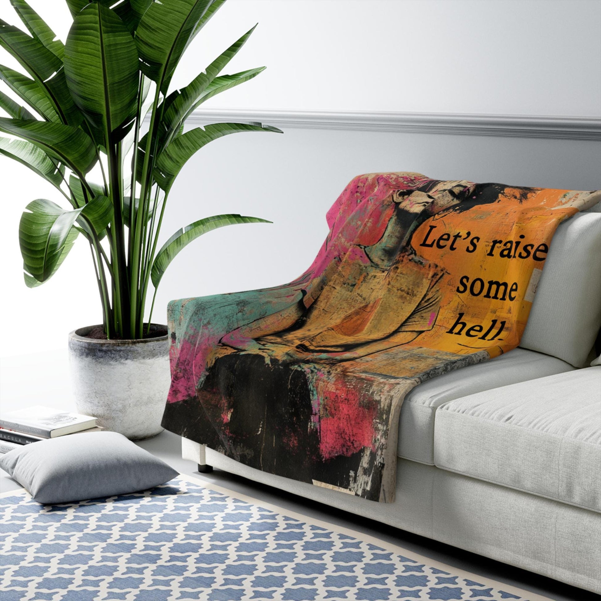 Wrap up in this colorful, poignant "Let's raise some hell" blanket. Even the ones smashing the patriarchy need a cozy rest! Unbelievably fluffy and warm - this high-quality cozy fleece blanket is impossible to leave behind wherever one might go. The perfect size for snuggling on the couch, by the fireplace, or at outdoor events. These blankets are incredibly warm, with print on one side and a plush backside for extra coziness.