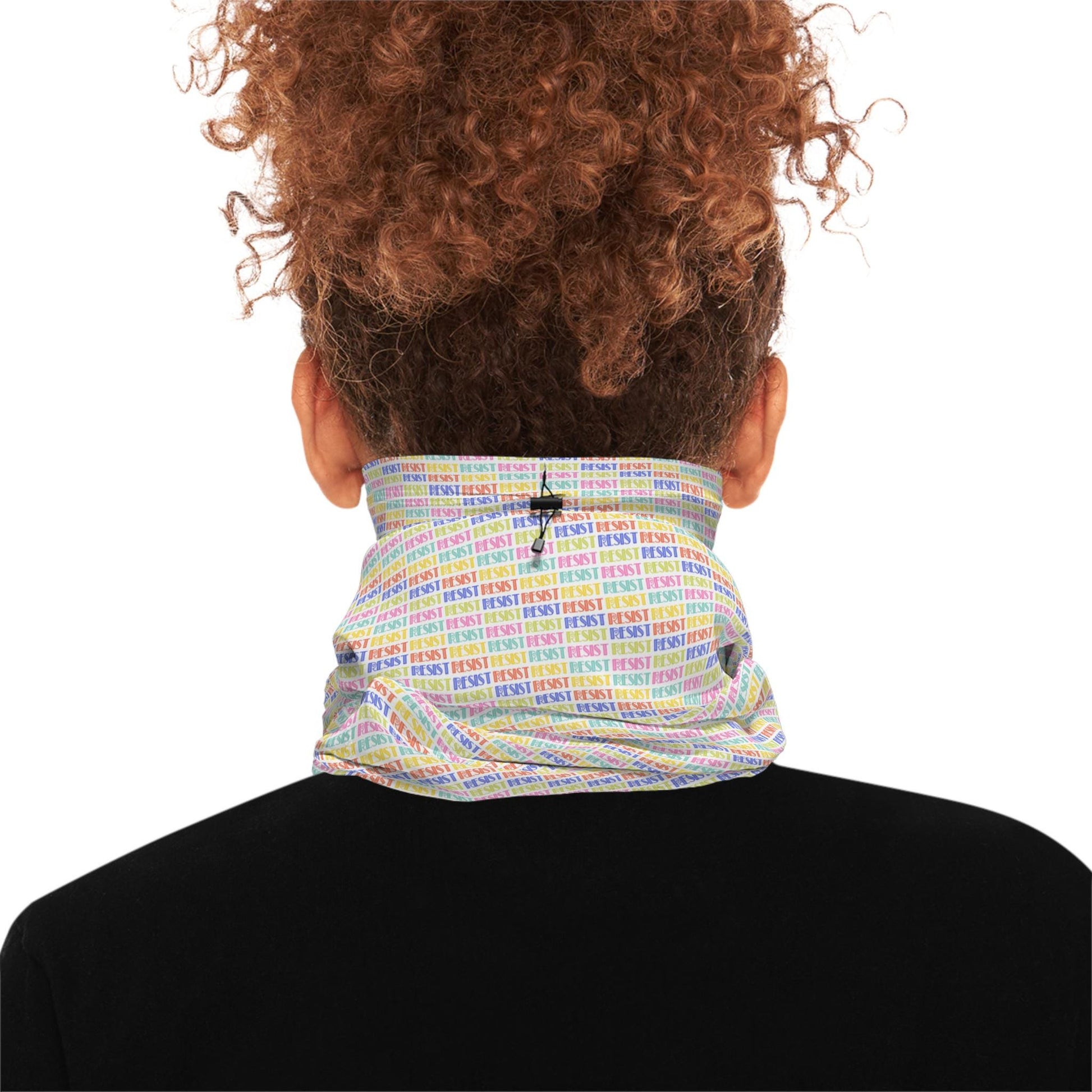 Stay warm and speak your voice with this "Resist" neck gaiter. Perfect to wear over your face to protect your identity, or for an everyday statement. This gaiter is made for winter - it's warm, fleece-feeling fabric with an adjustable drawstring to keep it comfortably in place. It can also be used as a hood.