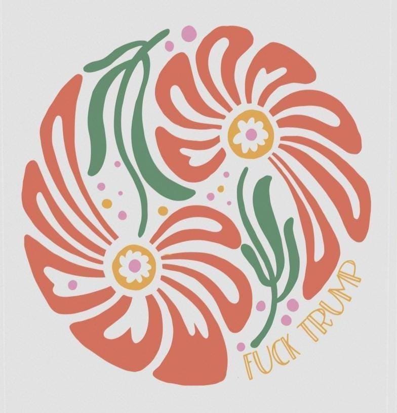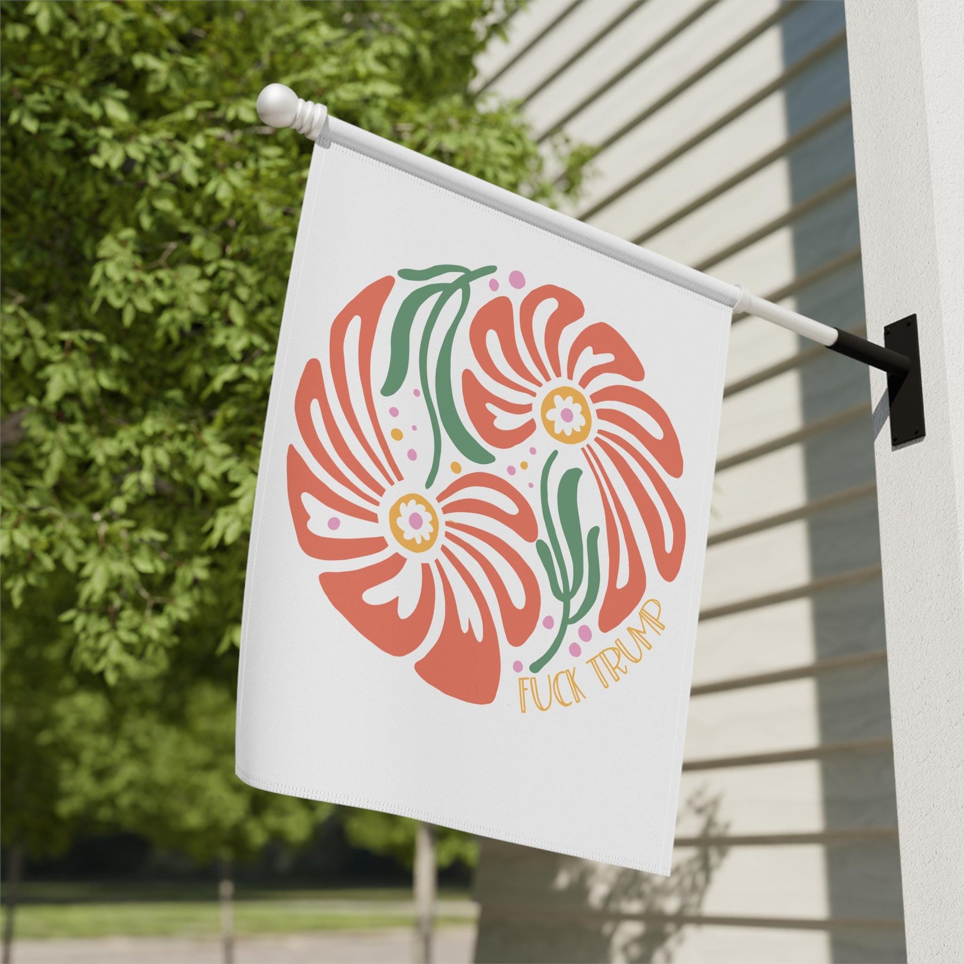 This boho floral "Fuck Trump" garden flag is the perfect way to express where you stand on both climate change and the patriarchy. Perfect gift for him, her, parents, relatives, and any other feminist or rebel you know! Made with lightweight yet highly durable poly poplin-canvas fabric, these banners come in two sizes (12'' × 18'' and 24.5'' × 32'') and feature a top sleeve for easy placement on poles. Your design goes in crisp detail and color on both sides of the flag.